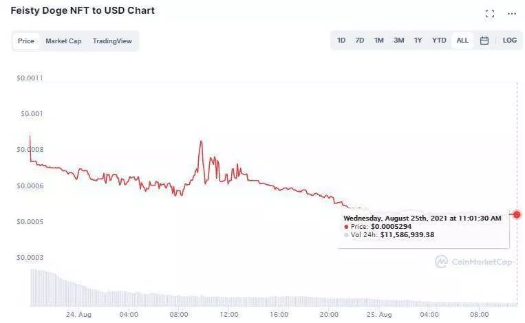 8月23 日, path.eth@Cryptopathic 创建了 Feisty Doge 的 NFT 代币 NFD,NFD 将原名为 Kabosu 的柴犬(狗狗币头像原型)一张照片所有权进行分割,总量为 1000 亿份,发行当日,NFD 最高涨至 0.0009 美元,近 24 小时交易量超 1.4 亿美元。这张图片一跃成为了估值最昂贵的 NFT。