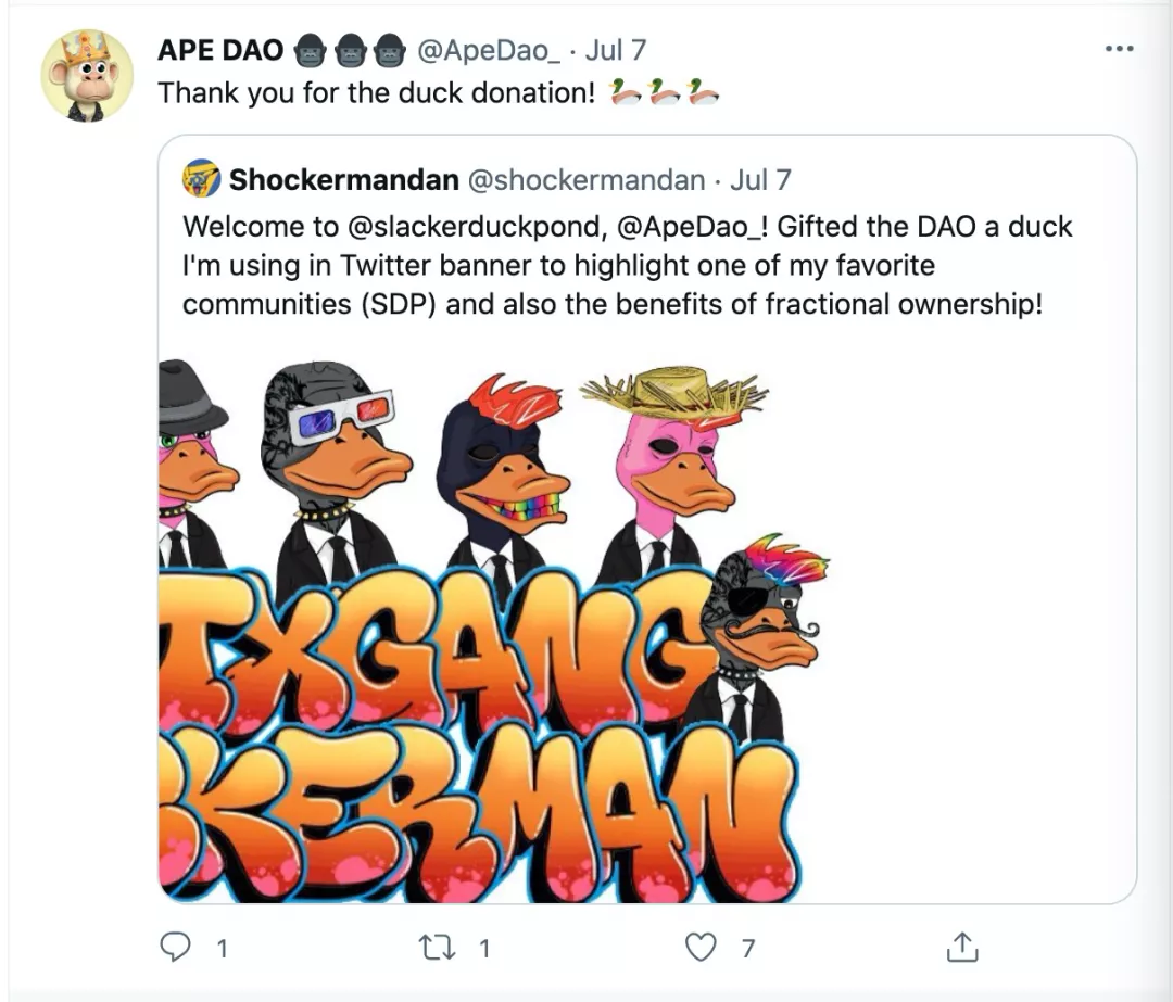 这样的实践,代表了一种「碎片化众筹」的趋势,而这种趋势会促使一种新型社区的出现:NFTs+DAO。它执行力惊人,也更灵活,通过小范围社区管理 NFT,注重社区,利益捆绑,共享收益。