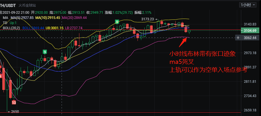 从日下看币价运行布林带下轨区域,下轨开始走平,目前币价在ma5与ma10区间震荡。预估是要走一段时间的震荡走势了。4小时线看td9转序列指标,短周期见顶信号,ma5拐头向下有交叉死叉的迹象。布林带上轨位置再3230附近。故此此位置可以作为稳健者空单的进场点位置。激进的可以参考3180-3150就进场日内短撸没问题。小时线看布林带有张口向下的迹象。Ma5交叉ma10死叉。综合来看今日大概率走震荡下跌走势。预估最多还会有一次的拉高。或者不出现拉高就直接震荡下跌,故此B哥建议稳健的等一波拉高(3180-3230)再来空,激进的直接3150附近就开始布局空。以高空为主的思路。