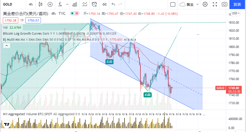 黄金只是去跟随了美指的冲高一笔,单从四小时这个下降通道去看,有破位1740一线止步现象,上方需要去重回的较关键位置在1770一线,