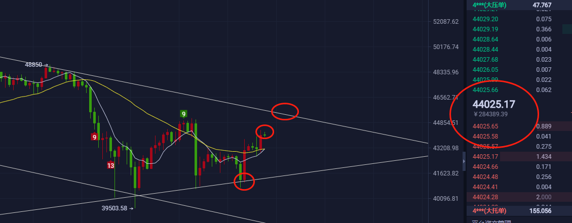 先从大周期来分析,周线开盘后持续上涨,站稳趋势通道上方,KDJ死叉走完,下轨有拐头向中轨运行,布林带中轨40500附近,上周触及反弹后今日开盘站稳,目前MA均线压制在45800附近,3日线超买量能增加,KDJ金叉有继续延续上涨迹象,日均线和布林带粘合趋势通道线压制在45200附近,这个点位重点关注,首次触及可介入博利。
