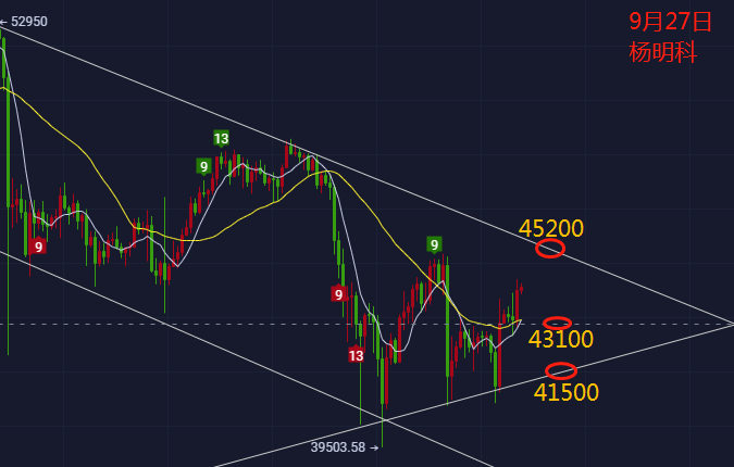 在看日线昨日收取较长下影阳线,主力在这点上控盘比较恶心了,消息面上全部发布空头情绪,大数据预计走空的韭菜已经得到主力的预期状态,在下跌40700关口后,烟雾弹放完后,直接开始拉升,不给空头任何机会,杨哥也在文章中多次提出,我们不要与市场跟风,要逆向操作,这样你的机会才会多。日线大家日内关注水平支撑43100附近,因为这也是日均线的前期压制转支撑位。日内如果触及直接做多。
