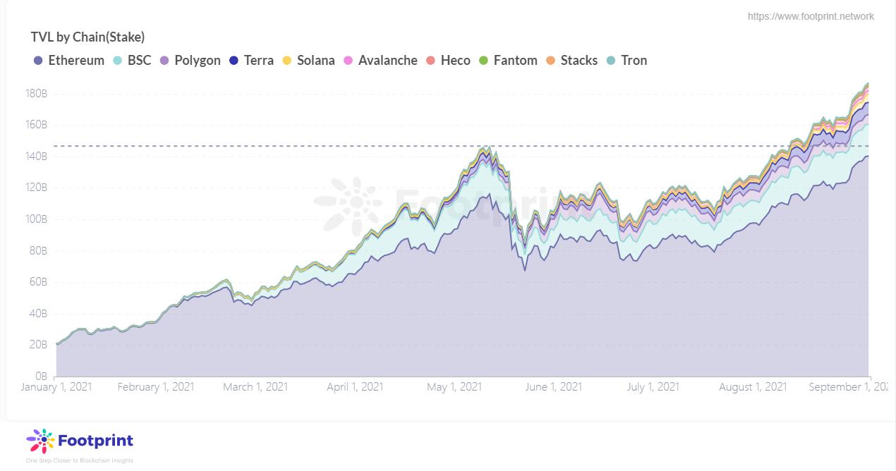 各公链TVL堆积图(自2021年1月),数据来源:Footprint Analytics
