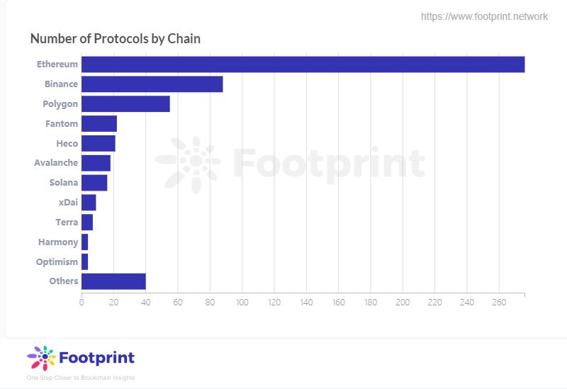 根据Footprint Analytics上收录的各公链协议数量,以太坊已有276个协议,是第二名BSC的3.14倍,紧随其后的Polygon、Fanton、Avalanche也纷纷开启激励计划,相比以太坊它们拥有更吸引人的手续费及更快速的交易速度,第二梯队的公链在未来的发展也不容小觑。