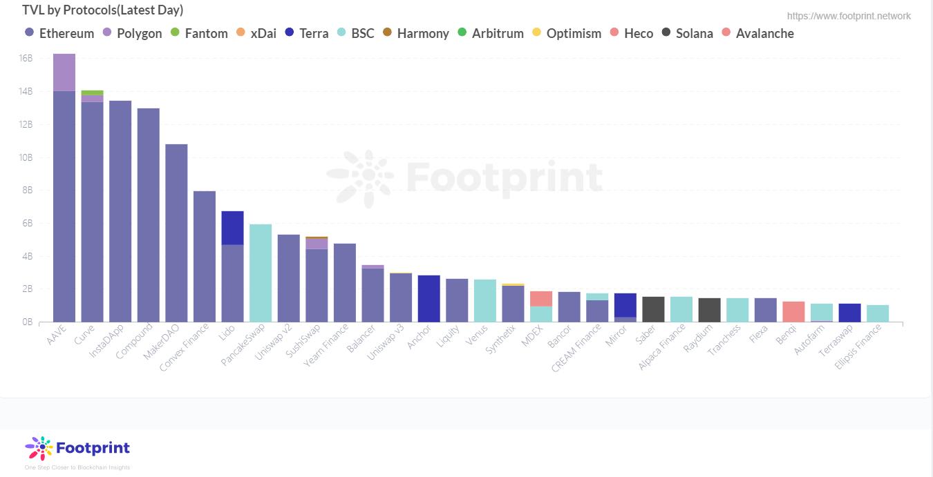 TVL前30的协议中,以太坊便占据了18个,第一为Aave凭借跨链部署了Polygon远超第二名近200万,紧随其后的InstaDApp、Curve、Compound三者均约1300万至1400万不相上下。BSC上有8个协议进入前30,PancakeSwap当之无愧以597万排名第一,其次为只有其一半体量的Venus。Terra以拥有4个协议入围排名第三,此公链上以Lending类的Anchor为首,其次为同在以太坊上有部署的Lido和Mirror。