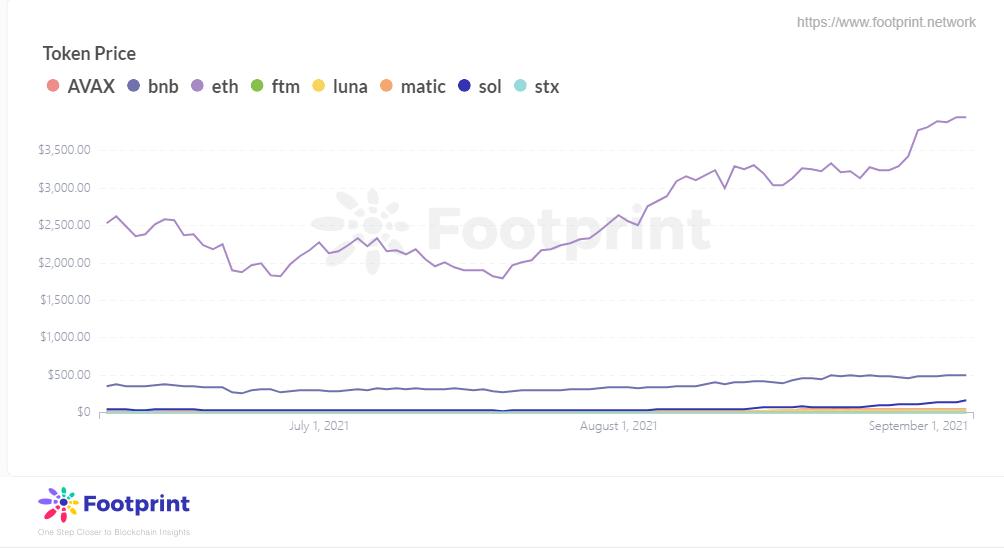 各公链代币价格(自2021年6月),数据来源:Footprint Analytics