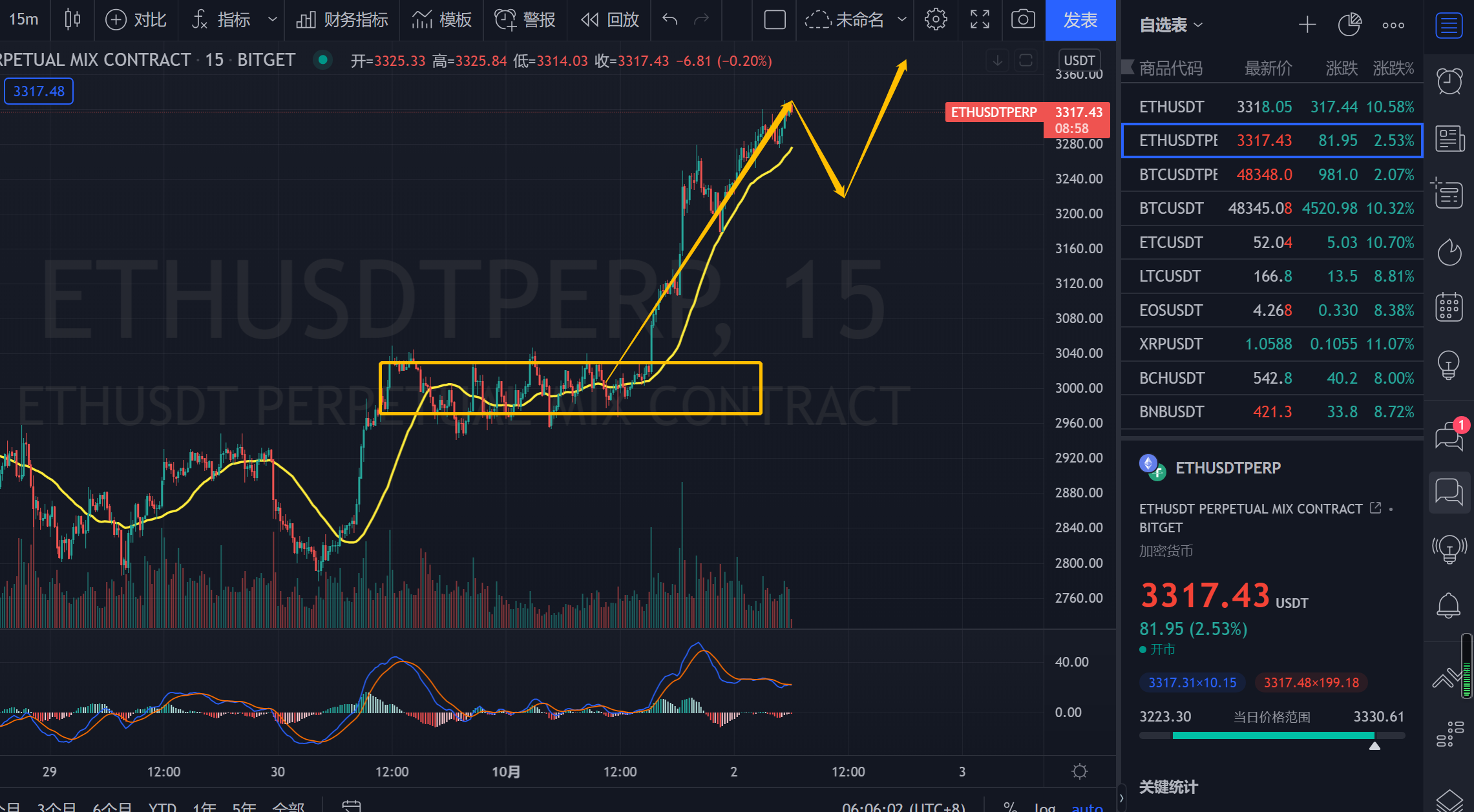 姨太15F的走势也是如此目前这笔15F的上依然还是在走延伸的走势并没有结束的迹象。耐心等待这笔15F的一笔下跌结束在继续入场。这里目前已经到达前期压力区域了。短期不还是不要再追高的操作为妙