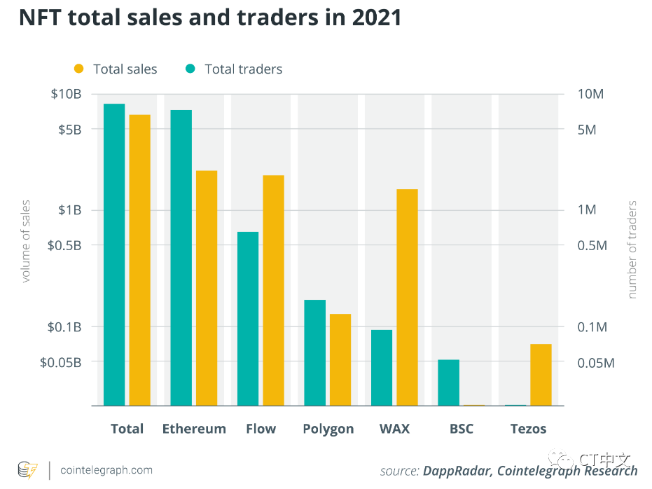 然而,尽管以太坊目前具有优势,但市场上仍有一系列重要的竞争对手。从下面的NFT总销售额和交易者的图表中可以看出,Worldwide Asset eXchange(WAX)、Polygon和Flow代表了强大的对立面。2021年迄今为止,每三个交易员就有一个使用Flow,每四个交易员就有一个使用WAX,尽管今年总销售额的近90%发生在以太坊上。