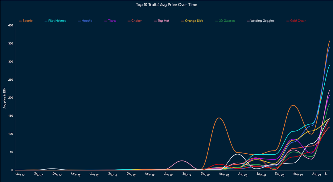 值得注意的是,最有价值的特征并不总是最稀缺的特征。如果我们考虑这些特征的价值随着时间的推移而变化,我们还可以看到,特征的流行程度也随着时间的推移而变化,这很有意思。