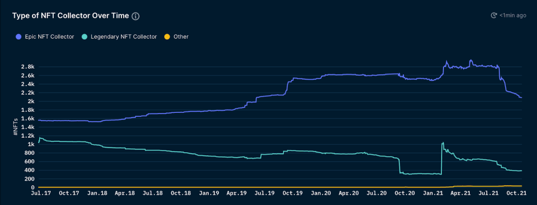 而且,看看不同类型的NFT收藏家的交易随时间的演变也显示,"传奇NFT收藏家"的交易在整个交易量中所占的比例越来越小。(传奇收藏家代表了ERC721代币交易中的前0.1%收藏家)。