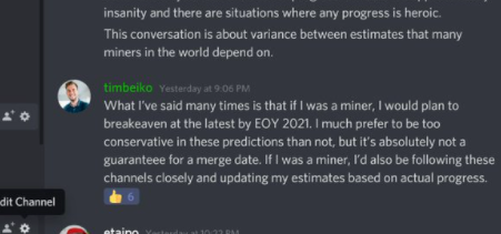5月,以太坊核心开发人员 Tim Beiko 也在Discord社群里表示,“矿工应当在今年年底前达到收支平衡。”这句话其实也在暗示年底前或将彻底结束目前所用的 PoW 共识。
