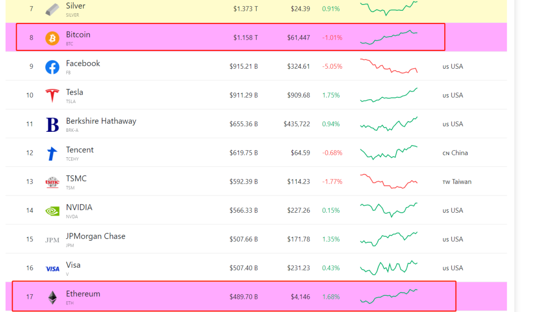 根据 companiesmarketcap 数据显示,目前比特币的总市值为 1.158T, 而以太坊仅有其不到1/2的市值。但从以太坊丰富的用例,和无可比拟的生态来看,依旧有巨大的上涨空间。