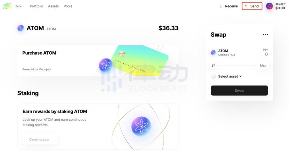 Emeris 是一个统一的操作 Cosmos 生态基础功能的前端平台,由官方团队负责开发,将支持基本的交易、跨链,以及 PoS 质押(尚未推出)等基础功能。如果需要进行 IBC 跨链转账,只需要点击网站首页的 Send 按钮。