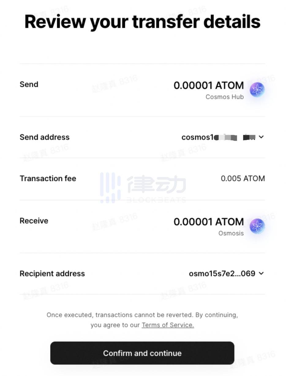 我们以左侧更通用的 IBC 转账功能为例。在点击后进入的界面中,需要用户输入收款方地址(注意这里只需要输入地址,并不需要特意注明地址所在的链,因为地址格式中已经包含了这个信息)。这里我们输入刚才用到的 Osmosis 链地址后,点击确认。