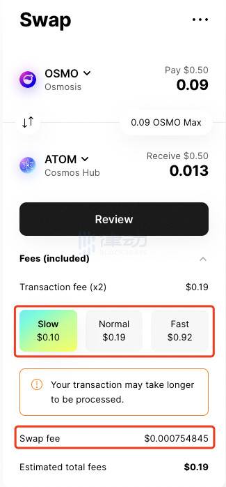 因此当卖出资产与买入资产处于不同的链上时(如下图),交易者一共需要支付两笔费用。一是调用 IBC 的跨链费(红框 1),二是 Swap 费用(红框 2)。