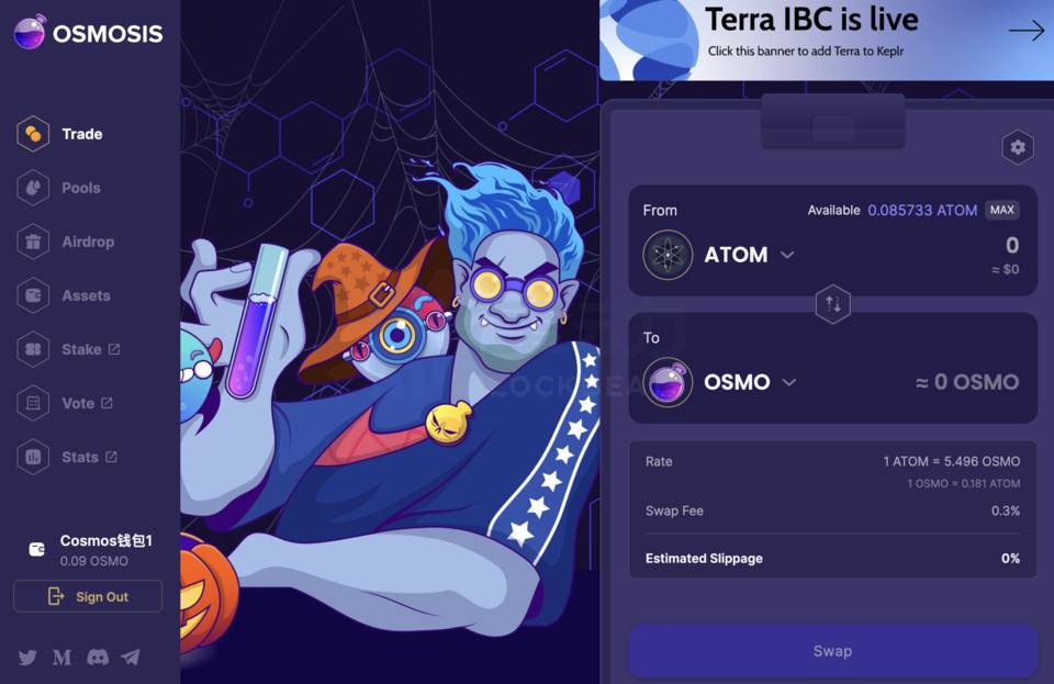 Osmosis 是一条基于 Cosmos SDK 构建的独立应用链,同样由开发了 Keplr 钱包的团队开发。目前其主网已经通过 IBC 协议连接到了 Cosmos Hub 上,因此可以顺畅的与 Cosmos 生态中的其他资产进行跨链交互。