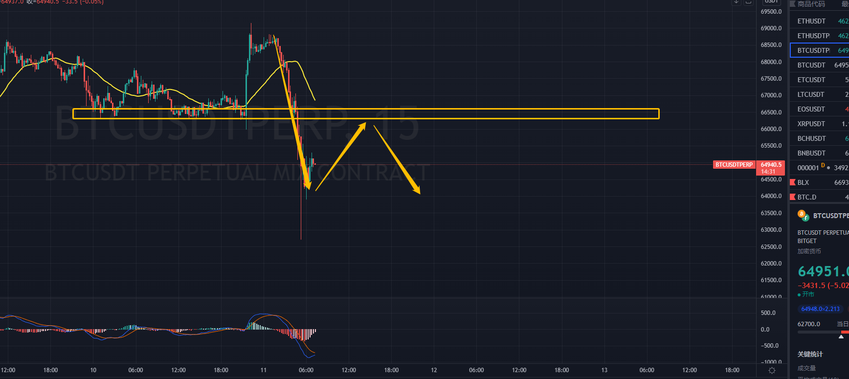 大饼15F的结构,15F的结构的话目前只运行了第一笔1H的下跌,后面反弹如果不能突破66000的话则是15F的三卖。所以从1H级别-15F的级别都是面临的调整的走势,所以短期做多是不能够入场的。需要耐心等待市场走完这笔1H的下跌,核心观察1H的中枢上沿是否能够守住。