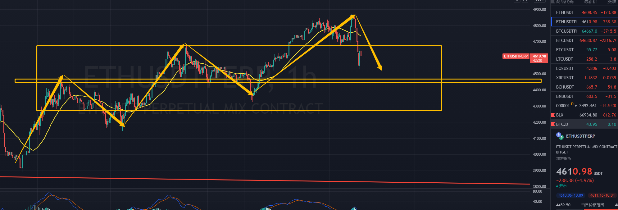 大饼1H的结构,目前是一笔1H的回踩。核心是不能够在跌破62500这个位置了。如果跌破了的话那么风险就极大,而且日线级别还面临的日线顶背的风险,所以面对种种风险的话,这几天就核心观察62500的得失,如果跌破了的话那么现货必须离场,不然日线一旦顶背,所面临的调整也好风险也罢会特别的大。