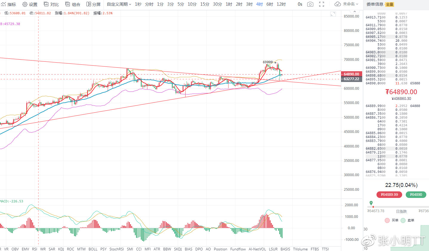 夜间行情在刷新新高之后一波暴跌,直接插针至62500附近然后开始回啦,于64000一线开始震荡。正好验证了我们昨天所给出的64000一线开多的建议。同时我们从盘面上去看,夜间的快跌并没有击穿下方支撑位置,换个角度去说这也就是行情守住了上行趋势,出现这种调整更多的就是在给我们交易的机会。而在这个时候很多人在交易上可能会更多的倾向于以空为主,毕竟下跌远远比上涨来的干脆,可我依然坚持我的看法,行情上还有最后一波上行给出来才会真正的开始下跌,今天日内依然可以依托前期三角收敛区间的末端支撑去开多即可,关键点位关注64500---63500即可。