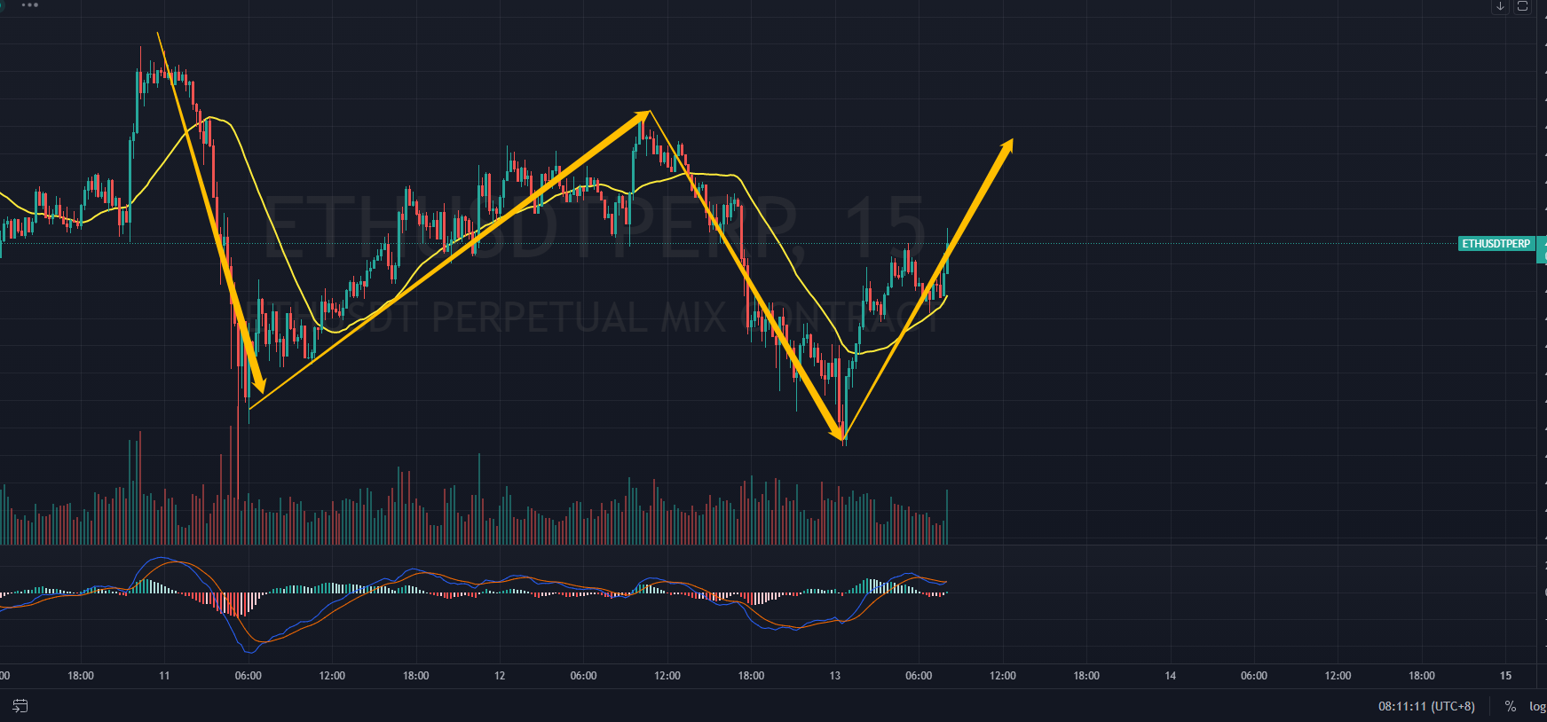 姨太15F的结构,姨太的结构还是如期,并没有跌破前面的低点,所以姨太依然还是要强于大饼太多,整体的话做多姨太的风险较低,能够获利概率大,而且空间足够,比大饼强势,目前姨太还是在运行这笔15F的上。