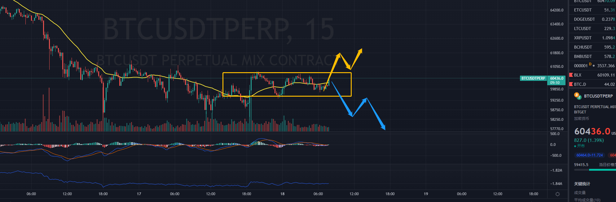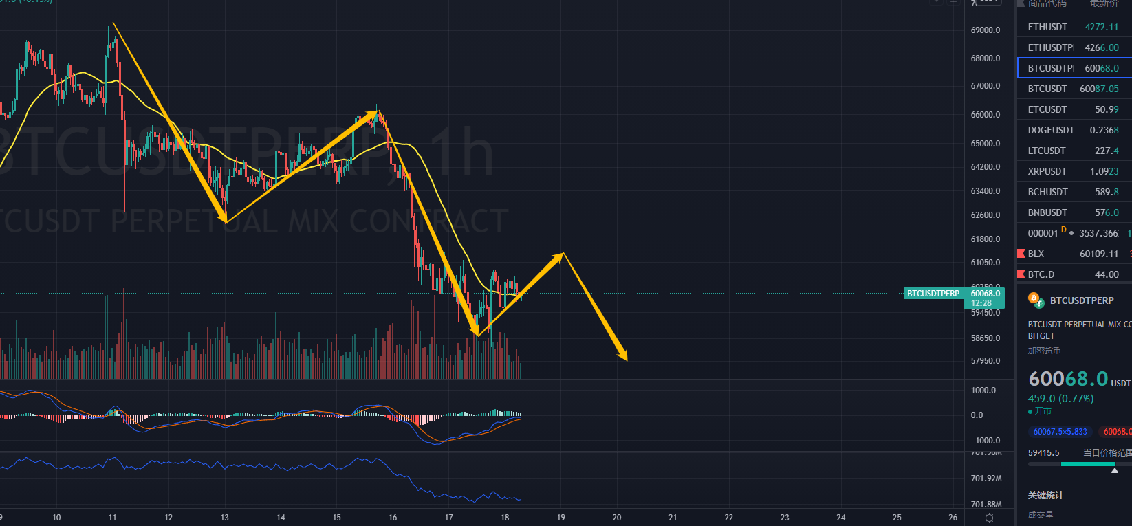 大饼1H的结构,目前还是在运行第四笔1H的反弹,这里就看59000是否能够跌破。如果不能够跌破的话,还是有机会继续走15F的中枢,在往上蹭蹭到615附近在下来,不过从整体来看目前1H的MACD已经回抽0轴,整体走势依然还是很弱,就看是否能够突破60500了在次突破的话就能在上去一些,不然走势很难看了。