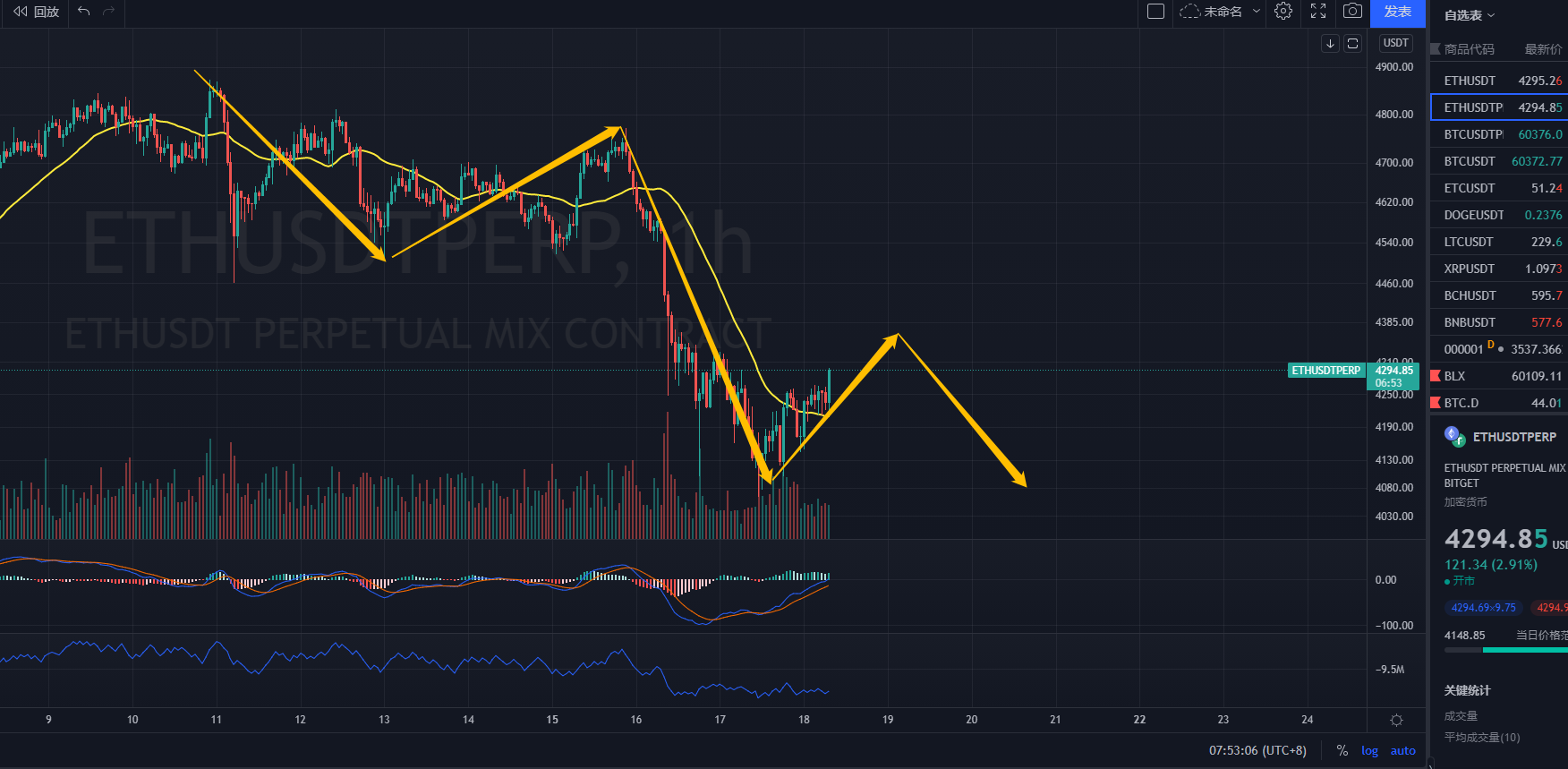 姨太1H的结构,目前姨太1H的结构跟大饼一样,依然还是在走第四笔1H的反弹,这笔反弹之后还会有第五笔1H的下跌要运行的。第五笔才是入场最安全的机会,其他时候的多都是短线多单。耐心等待第五笔下跌出现。
