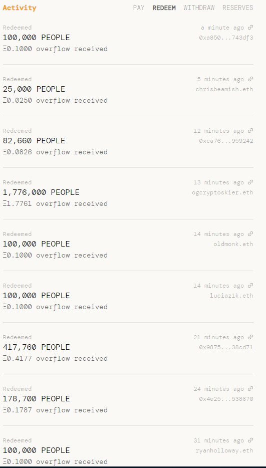 最有趣的事情是,根据链上数据显示,居然有不少用户选择赎回了 PEOPLE(将 PEOPLE 以原价 0.000001 ETH 换回曾经存入的以太坊),要知道目前 PEOPLE 目前的市价已经是最初的近 5 倍。而这种赎回动作,由于减少了 PEOPLE 的流动量,便会使其产生通缩效应,并再一次促其上涨。