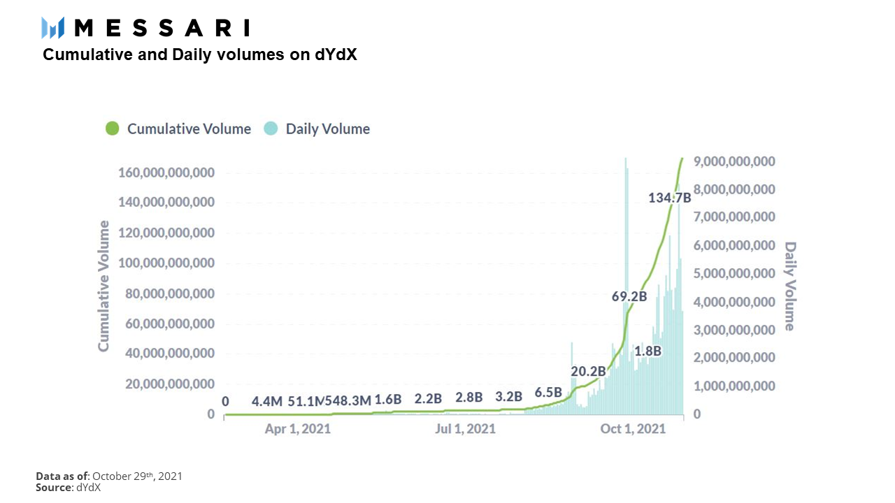 交易量的爆炸性增长不仅得益于第2层协议提供的高性能dYdX,还得益于DYDX代币的推出。