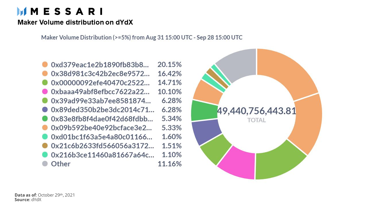 dYdX 约有4.5万名存款人,其中大部分是专业交易员、机构交易员和做市商。与任何流动性市场一样,大部分交易量是由活跃的做市商推动的。
