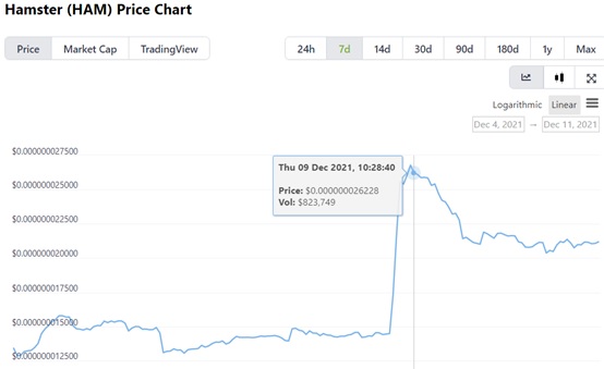 仓鼠币 Hamster Coin 也冒了出来,就在 Brad Sherman 谈到这个数字货币之后,此前一直低迷的 Hamster Coin(HAM)仿佛起死回生,价格在 12 月 9 日暴涨了 66%。