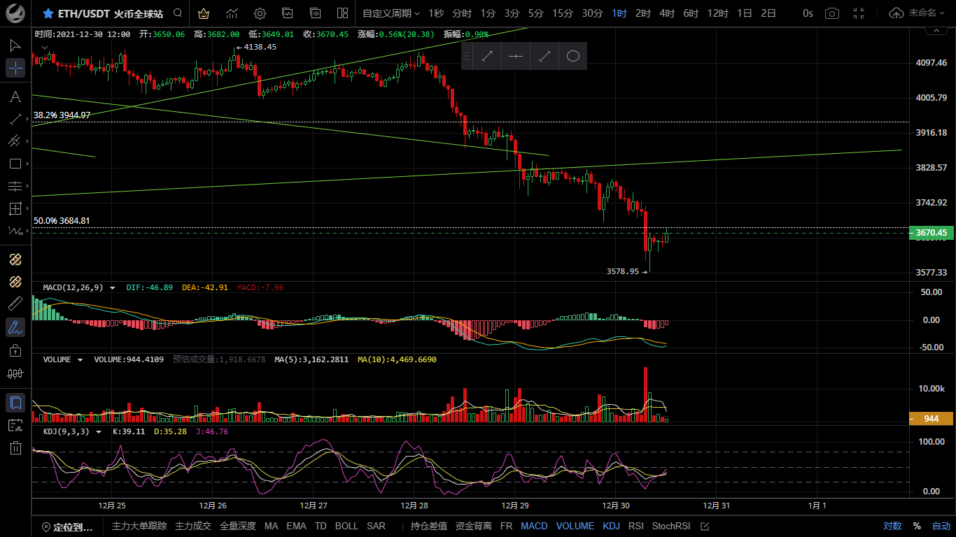 以太坊晚间反弹至4800后受阻,一路下行跌破前低在3580附近支撑,随后反弹100美金,目前在3670附近运行,小时级别布林带下轨压制,kdj向上发散,短期有反弹需求。日内依然高空为主。关注上方压力3700-3800,下方支撑3580-3500