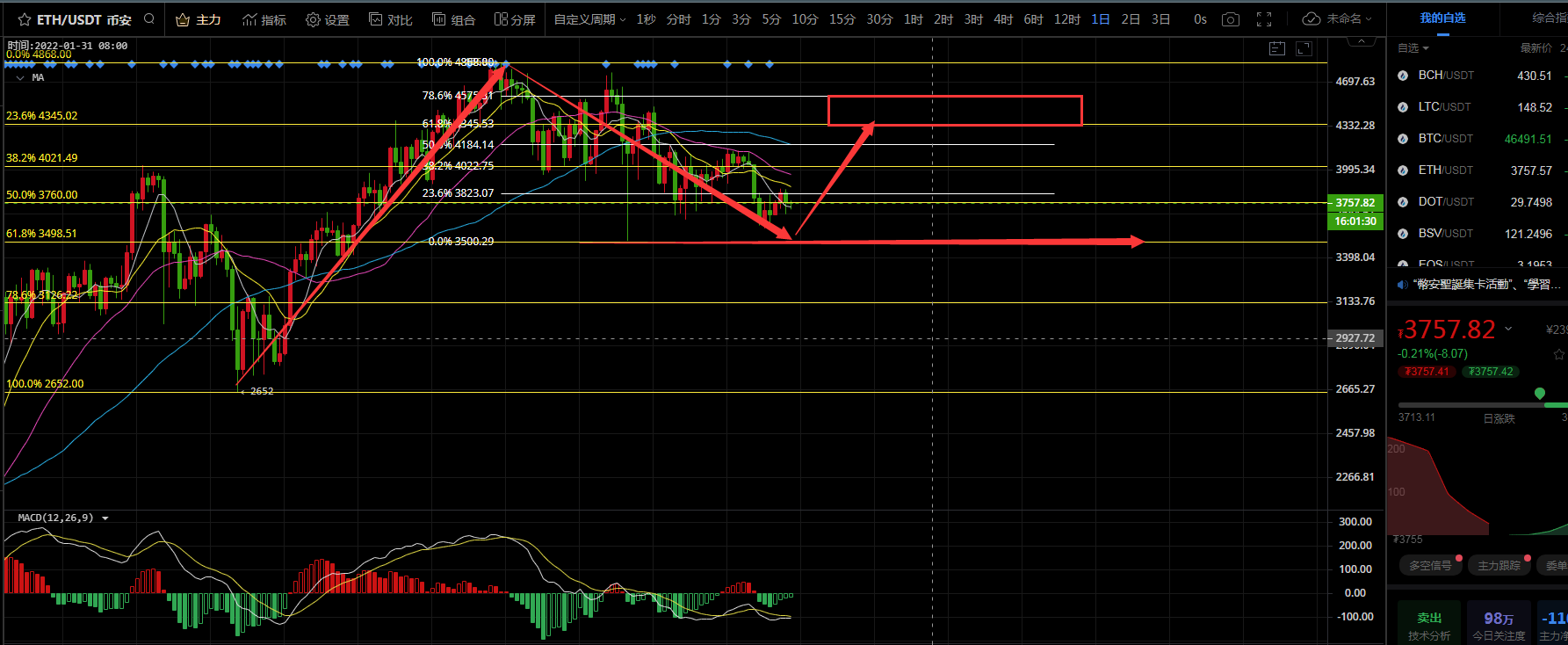 日线级别上看,前面的下跌刚好触及到支撑位3500附近,而后反弹后继续下跌的行情并没有去跌破3500位置支撑,从以太整体走势上看,从高点4868跌至3500并没有给到很大的下跌,行情是从2562位置反弹上去的,总体上看,以太的整体走势还是处于强势中的,并没有去给到很深的下跌,以太的交易策略我们也是围绕底部3500支撑去开多即可,止损100个点就好,这波反弹目标位置在4340-4570区间,但以太整体上我个人看好以太最后一波还会去走一波突破,会突破4868这一高点位置,交易上大家不要去着急做空,这波反弹结束之后我会提示大家一起去做空的,在2022年争取一起暴富;交易上控制仓位,带好止损;