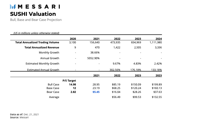 现在,我们使用平均市销率,结合 Sushi DEX 交易量的估计增长来计算 SUSHI 代币的价值,如下所示。