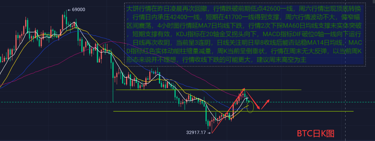 昨晚的大饼多空争夺激烈,有些激进的朋友在昨晚点位还是那个点位,但是仓位没了,行情在昨晚上下扫盘,行情在突破前高45600触及45820一线再次回落,在今日凌晨到早8收线连续下跌,最低触及42600一线,日线方面行情收上插针阴线,早8日线收线行情跌破MA7日均线支撑,随后行情反弹呈倒垂型K线,KDJ指标再次死叉向下,MACD指标多头动能柱缩量减量,周K方面当前K线呈上插针,行情触及MA60日均线回落,上方关注46000-46500区间压力,以当前走势来看,行情有回撤迹象,下方重点先关注41600,破位关注日线MA14日均线40800一线,4小时图日内行情连续插针,连续3根K线插针触及BOLL下轨反弹,行情反弹触及BOLL上轨承压,行情在42800一线有筑底迹象,短线方面行情有所反弹,行情图破BOLL中轨压力,短线有继续试探上轨压力的可能,短线可以在2月12日早8收线后轻仓空,利润空间看500-800,日内还是低多为主