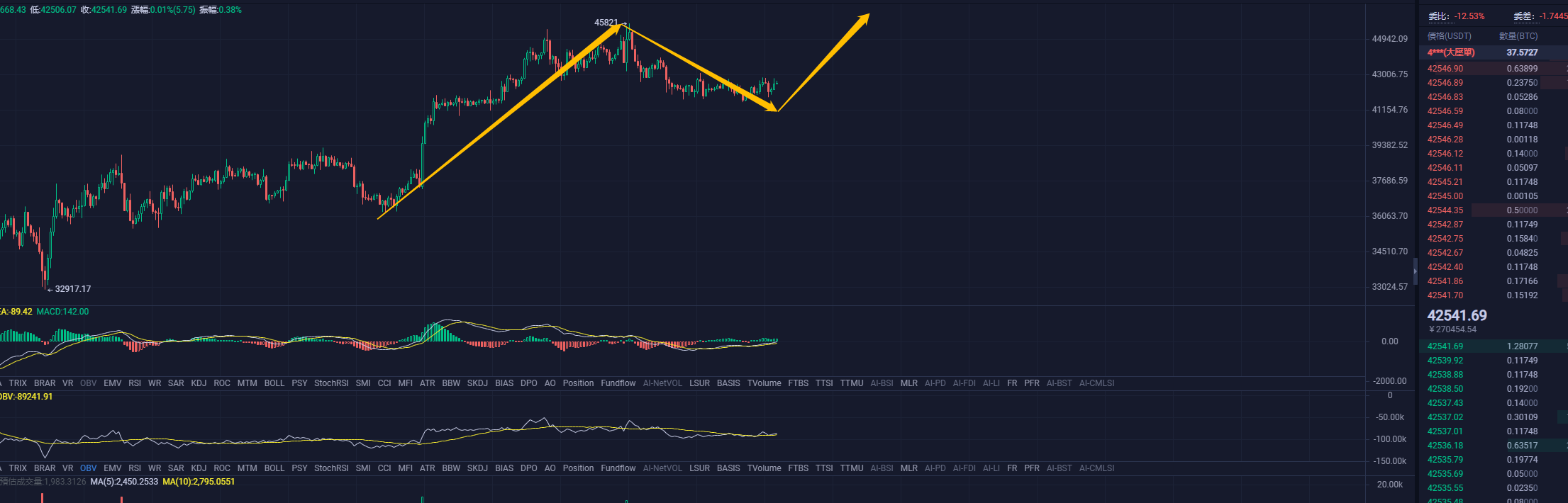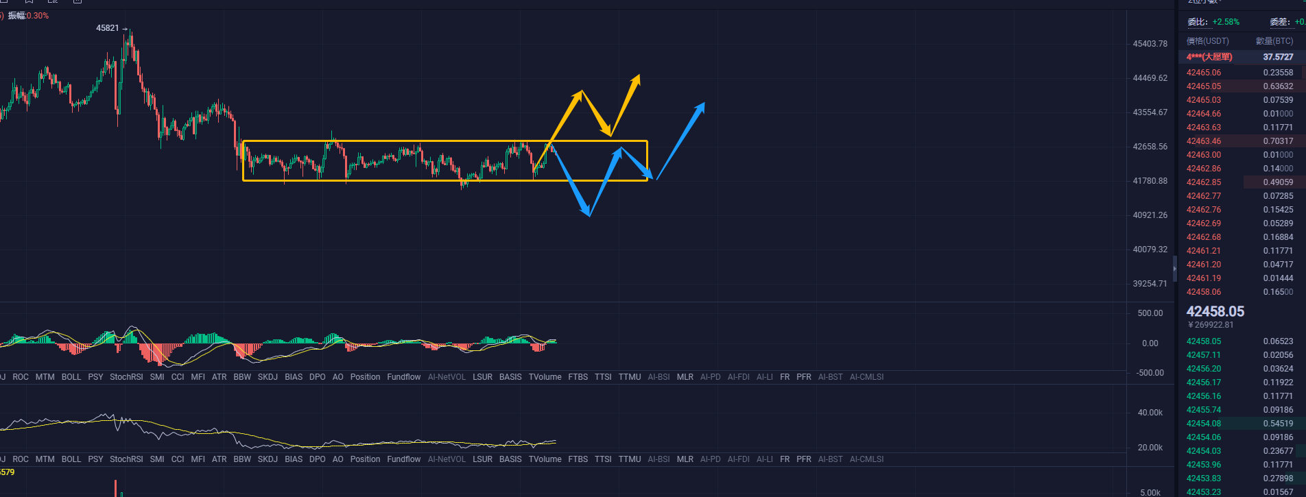 大饼2H的结构,目前来看的话这笔2H的下跌已经接近结束了。如果价格能够突破43000的话就能够确认这笔下跌的结束,在走一笔2H的上升,个人的目标是看到46000-47000这个区间,然后结束这笔日线笔的反弹,在继续下跌为主的走势了。反弹时间磨的越晚对多军越加的不利,所以目前的情况是,时间的流失不利于多军。
