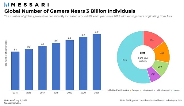 上图:自 2015 年以来全球游戏玩家的数量增长情况 (单位:十亿人),其中 2021 年全球游戏玩家接近 30 亿人。