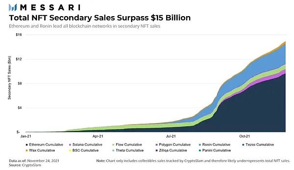 2021年,多个区块链网络的 NFT 二级市场销售总额超过 150 亿美元 (见下图),其中以太坊引领 NFT 交易。然而,以太坊网络交易成本的增加为其他新的区块链和 L2 可扩展性解决方案铺平了道路,如Solana、Ronin、ImmutableX、Polygon 等。