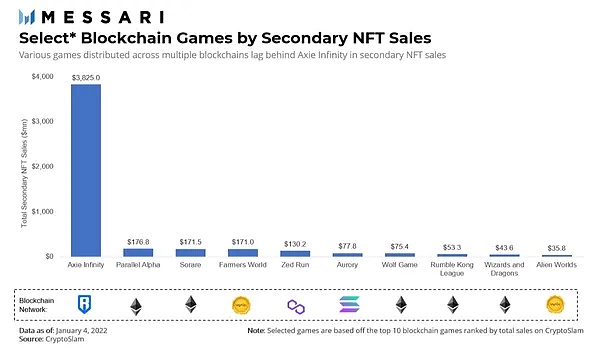 上图:各个区块链网络上的游戏的 NFT 二级销售额,数据截至2022年1月4日