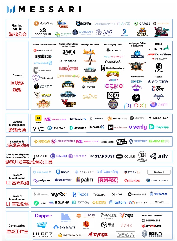 游戏工作室位于基础层,因为它们通常是游戏开发商,也是 L1和 L2 基础设施的开发者。Dapper Labs(开发了 CryptoKitties 和NBA Top Shot 等知名 NFT 项目)、Sky Mavis(开发了 Axie Infinity 游戏) 和Animoca Brands(旗下的区块链游戏包括 The Sandbox 和Crazy Kings 等)是拥有数亿资金的最富有的游戏开发商。最终,并非所有游戏工作室都能生存下来。然而,那些开发下一款重磅游戏的公司有潜力成为未来的下一个 Electronic Arts(艺电游戏公司)。