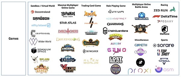 区块链游戏领域的最大层面是游戏本身。到目前为止,有着各种各样的游戏类型。一些最成功的类别包括交易卡游戏(比如 Axie Infinity)、大型多人在线角色扮演游戏(比如 DeFiKingdoms)、虚拟世界(比如 The Sandbox 和 Decentraland) 以及体育类游戏(比如 Sorare)。