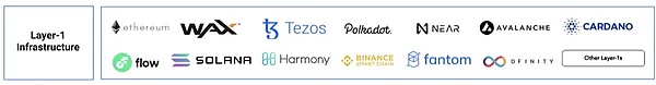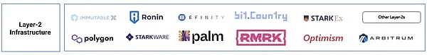 L1(第一层区块链网络) 基础设施是各种协议和应用的核心基础。虽然一些游戏构建在有着更高吞吐量的 L1 区块链(如Solana和Flow) 之上,但大多数以太坊游戏已经迁移到 L2 解决方案中。L1 的重要性来自于区块链游戏将利用 L1 上的其他可组合的协议,包括公会、金融化协议 (如 NFTX)、身份解决方案 (如以太坊域名服务 ENS)、市场和其他应用或服务。