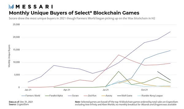 上图:几大主流区块链游戏的每月 NFT 买家数量变化情况。