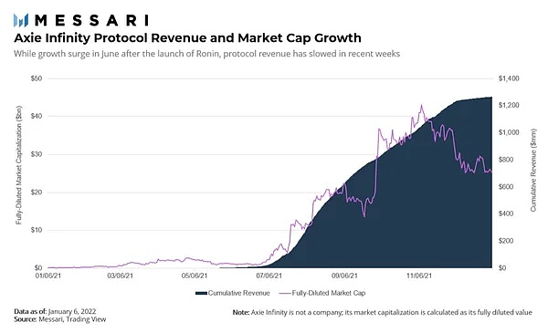 总的来说,该协议从这四个来源获得了超过 13 亿美元的收入,几乎所有收入都发生在 2021 年 6 月之后。这一时机恰逢该游戏背后的工作室 Sky Mavis 推出了自己的侧链 Ronin,这有助于降低用户的交易成本,并提高游戏的受欢迎程度。