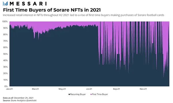 上图:2021 年 1 月以来,Sorare NFT 的首次买家 (紫色部分) 和重复买家 (黑色部分) 在其总买家的占比情况。