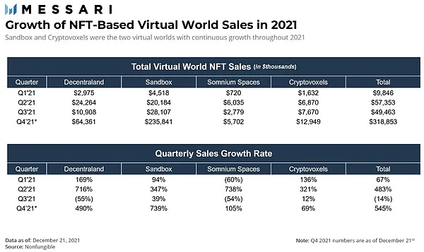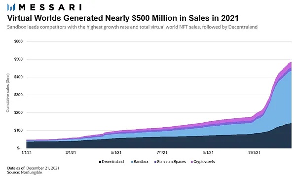 截至目前,虚拟世界已经创造了近 5 亿美元的 NFT 销售额(包括 NFT 虚拟土地和游戏内资产)。2021 年,虚拟世界的 NFT 销售额增长最快,创造了超过 3.2 亿美元的 NFT 销售额。如下图所示: