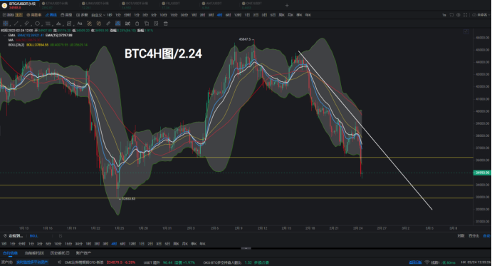 BTC4小时技术走势;昨日行情反弹至布林带中轨附近未能有效站稳,反收接近黄昏之星组合形态;午间12点4小时K线直接跌破36200--35500多重支撑并收于下方;方向空头但切不可追空