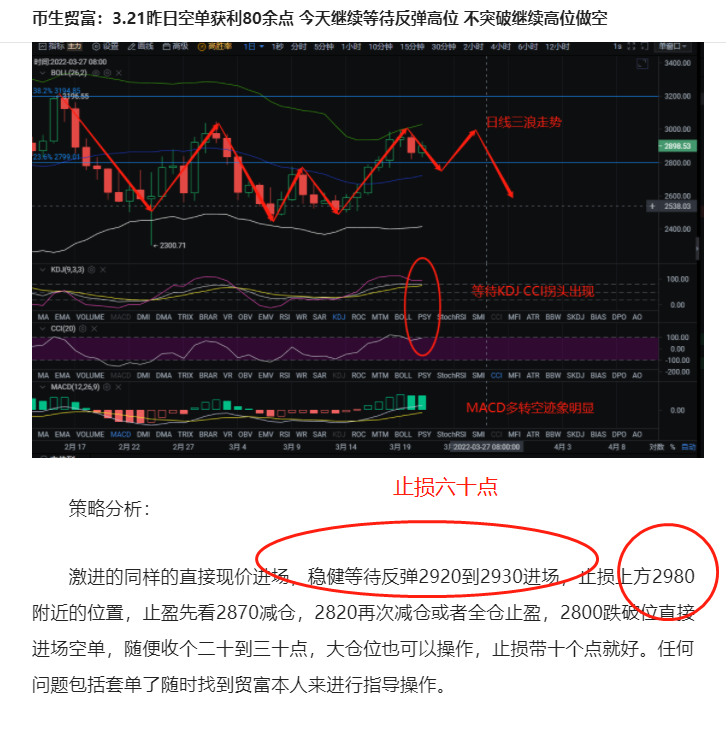 目前行情在经历了昨晚的震荡下行之后,最低位置是来到了接近2882附近的位置,随后在今早的八点就开始了反向逆势拉升最高点位也是拉升到了接近3055附近的位置,紧接着行情收了一根上影线之后就开始了在3020到3000慢慢震荡之路,不断地进行上下震荡,贸富本人昨天也是给出了2920到2930进场的空单,只不过在今早就被扫损了给出的2980的止损位置,前后止损接近60点,包括在今早拉升的时候贸富本人也是在早上八点多附近再次给出了一单反弹高空单,可惜再次被扫损并且由于拉升太快扫损了接近60点,前后止损接近100点,但是我相信大家肯定是和贸富本人有相同的想法和趋势的,当像这几天这种点位我相信大家也有不少人肯定是套牢空单的,因为在这种点位,是个正常人都是想做空的但是奈何多空比这种东西就是在这种时候开始体现的,再加上狗庄不可能让我们作为散户赚到钱,所以多次缓慢震荡下跌再急速拉升,这种趋势其实也是可以理解的,但是我们作为散户不能就这样被庄家给按在地上摩擦,要有所准备和动作,所以在目前的行情当中如果直接抓下跌抓不到,那么我们就换种思路,保持相反低位去做多,但是又由于我们的下跌不确定性,我们后续的话可以考虑低多短抓,反复的去震荡行情中再抓行情起来,中心思想就是每次开单就带二十个点止盈, 十个点止损,达到目标不管止损止盈就出局就好,因为在这种行情当中就像是今早的一波行情慢跌了一晚上早上就只需要几分钟就暴力拉升一百点,这换谁来讲都是需要做好风险控制的而不是盲目的去震荡行情中扛单,见好就收落袋为安才是最重要的。包括大家也有很多的币友在跟贸富本人进行咨询说老师技术指标应该怎么看,老师今天的行情当中什么什么指标应该怎么判断,这些话贸富本人是很想给大家进行解释的,但是奈何在目前的行情当中技术指标本身的作用已经偏离轨道了,正常的指标去看行情根本没办法去看的很清楚,并且技术指标我一直跟大家说的是技术指标是存在很严重的滞后性的,不能依靠只能参考,大家如果说有需要学习的可以咨询贸富本人跟随贸富本人边做单边学习,目前的话晚间行情小时线已经在不断的试探突破3000整数关口的,大家还是谨慎带好止盈止损做单注意风险控制!
