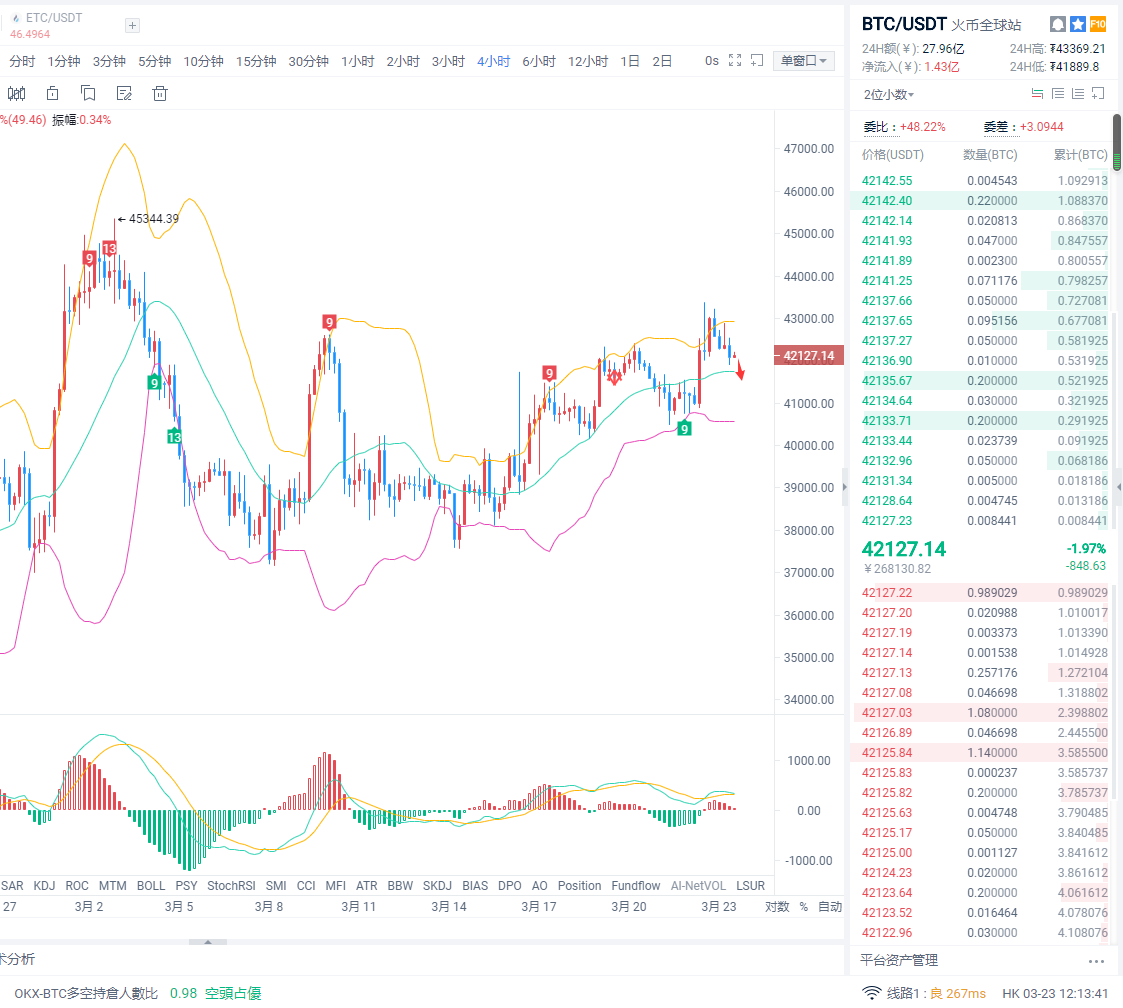 比特币昨日在43000附近出现双顶形态后,走势震荡走低最低触及41800回升,随后反弹至42500承压回落;从走势看,多次上攻受阻,上方高点重心下移,42500作为前期高点压力,在上攻突破后如果回踩能站稳,那么会成为再次上攻的起跳点,现在得而复失,M头有望进一步走出延续,所以在42500有效站稳前,操作以反弹空为主