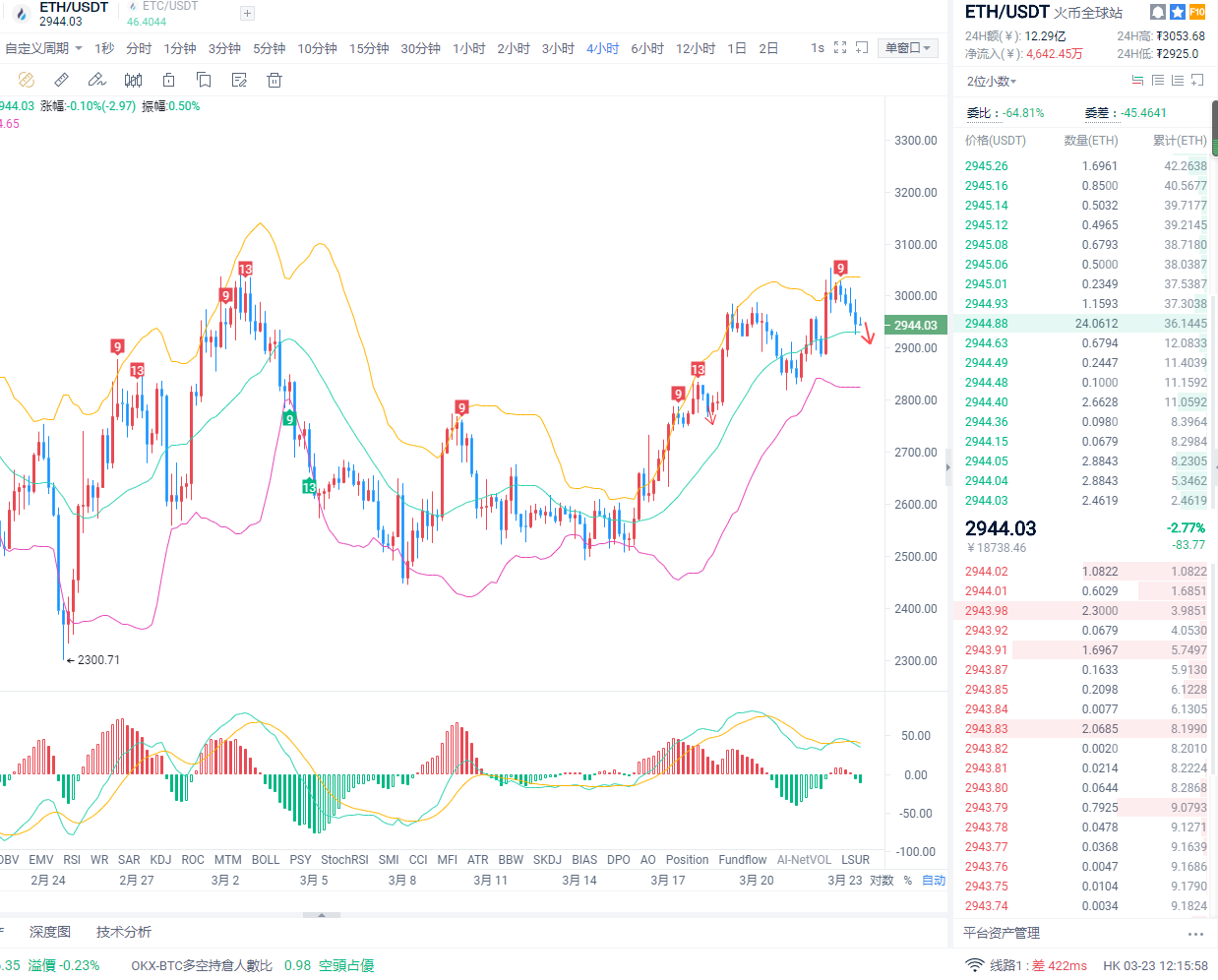 以太坊这次反弹幅度不及比特币,短线动能放量虽然尚未结束,但是日图和四小时指标拉涨都进入超买区,这种情况就得注意冲高回落的风险。结合盘面,尾盘后市调整下方短线支撑关注四小时中轨2930以及下轨2850位置,上方短期压力关注日内高点3050位置,如果出现再度放量那重点防守二月份那轮高点3200-3300区域,届时该区域也可作为中线看调整布局区域。