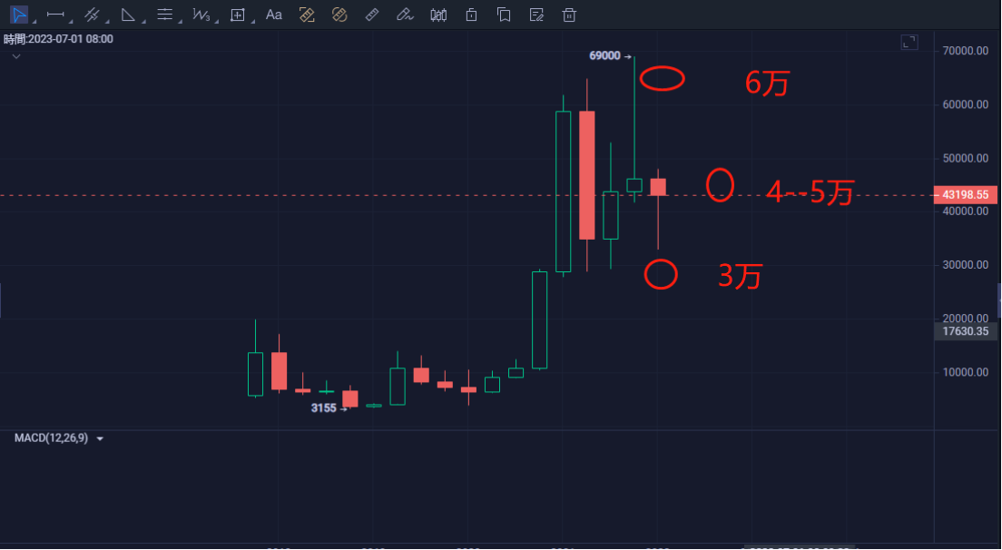 季度线3--6万,目前的周线主要看5万一线,第一季度要结束了,多空博弈开始,多注意小周期。